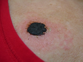 So, my belief is that the radiation from the rays of the tanning bed hit the tinea versicolor (fungus) and mutated it into a new pathogen that started destroying my skin and growing into a mass, not just on the surface, but well below also. On 4/26/05 I put an herbal preparation of Black Salve on, what was at the time a mass about the size of a half dollar. Over the years it looked like cauliflower on the surface of the skin which would bleed quite a bit so I wore band-aids over it for years. Effective Black Salve is next to impossible to find in the US but you can find it if you look hard enough. I felt tingling and then a burning sensation almost immediately after the application. Some people have felt the need to take aspirin or pain killers to help maintain the pain, I believe it will depend upon each individual case, but better to be prepared by having some on hand if the pain gets to be too much. That night the area around the spot swelled all around and out from it until the perimeter of swelling was about the size of a mans fist. The next morning I woke up and took a shower and the excess Black Salve washed off and left behind an indentation of the skin by about 3 millimeters which was covered by a black scab or eschar.